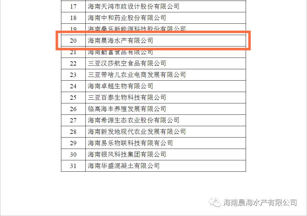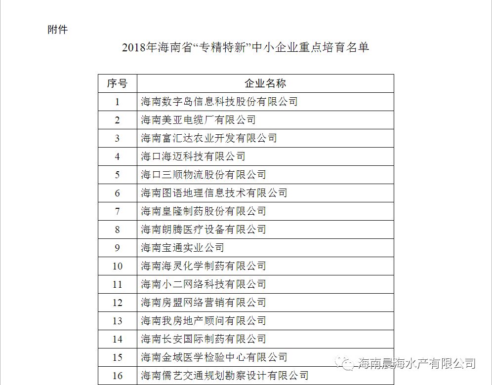 2018年8月,海南省工業(yè)和信息化廳關(guān)于2018年海南省“專精特新”中小微企業(yè)培育申報(bào)工作經(jīng)企業(yè)自主申報(bào)、市縣初審和專家評(píng)審結(jié)果出爐,海南晨海水產(chǎn)有限公司(以下簡(jiǎn)稱“公司”)成功入選31家海南省2018年“專精特新”中小企業(yè)重點(diǎn)培育企業(yè)之一。
