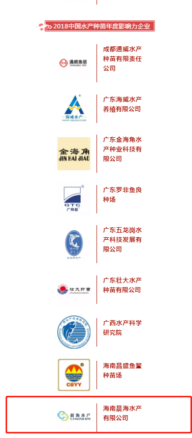 2018年12月31日,由水產(chǎn)行業(yè)權(quán)威媒體“當(dāng)代水產(chǎn)”、“騰氏水產(chǎn)商務(wù)網(wǎng)”共同發(fā)起的“水產(chǎn)苗·中國芯!2018中國水產(chǎn)種苗年度榮耀榜”評選活動(dòng)華麗揭榜,海南晨海水產(chǎn)有限公司獲評“2018中國水產(chǎn)苗種年度影響力企業(yè)”。